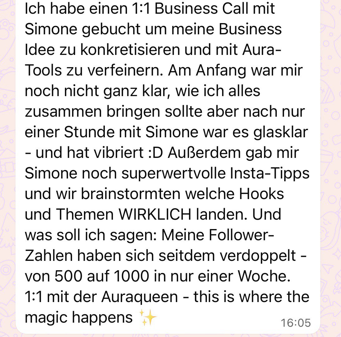 Dann eröffne dein Millionenfeld und sicher dir deinen exklusiven Aura VIP Tag mit Simone – persönlich, magisch und unvergesslich, direkt in München.